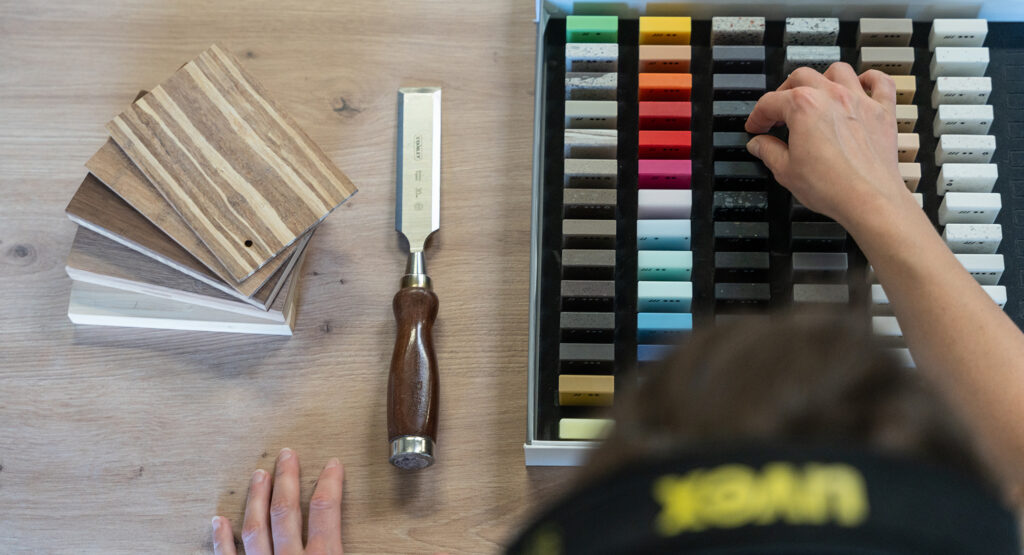 Notre engagement se prolonge jusque dans le choix des matériaux. Nous privilégions les ressources durables, issues de France ou d’Europe. Cette approche responsable nous guide au quotidien, à l’agence comme à l’atelier de menuiserie. Nous imaginons ainsi, du mobilier sur-mesure, durable et malin.