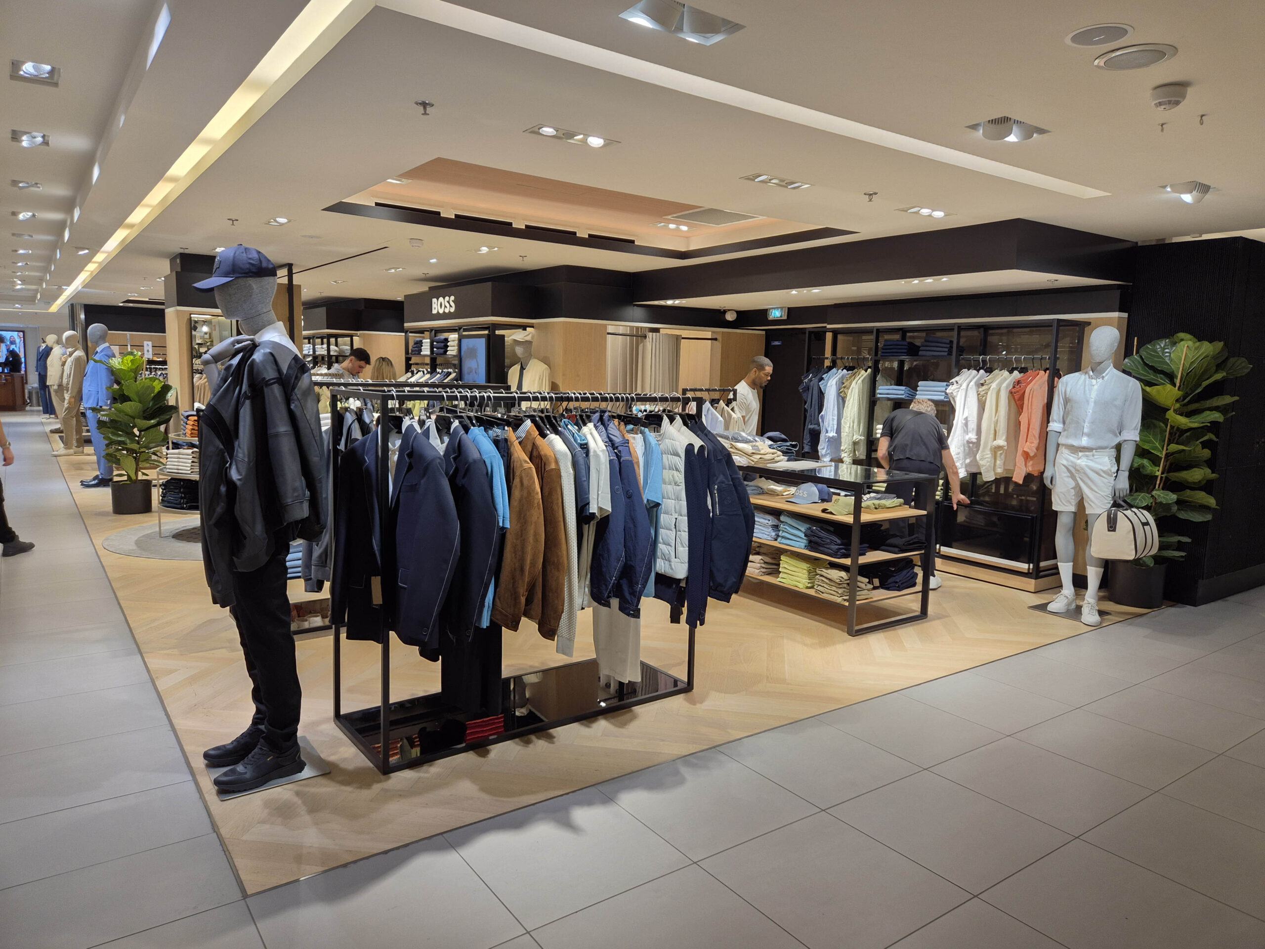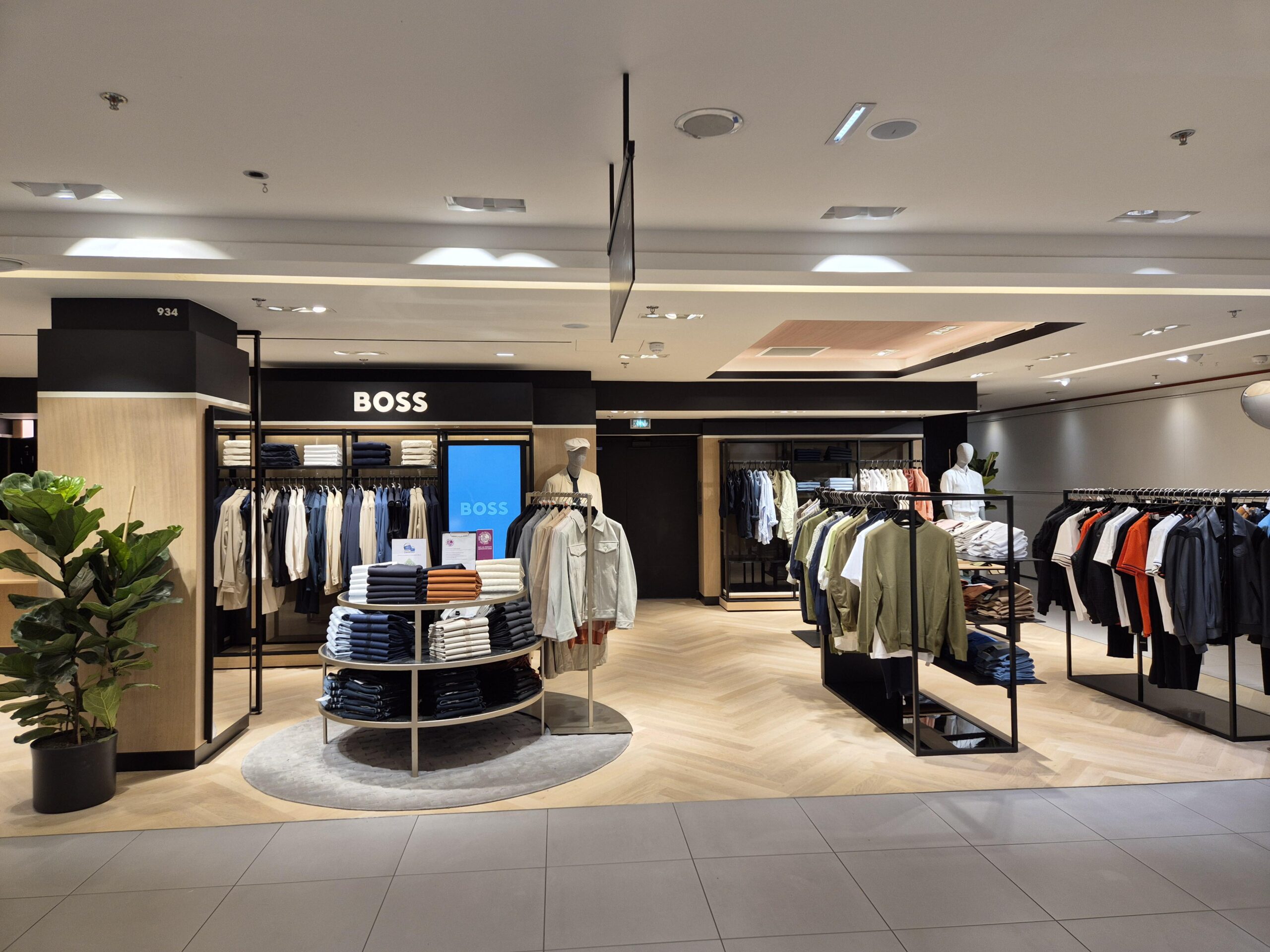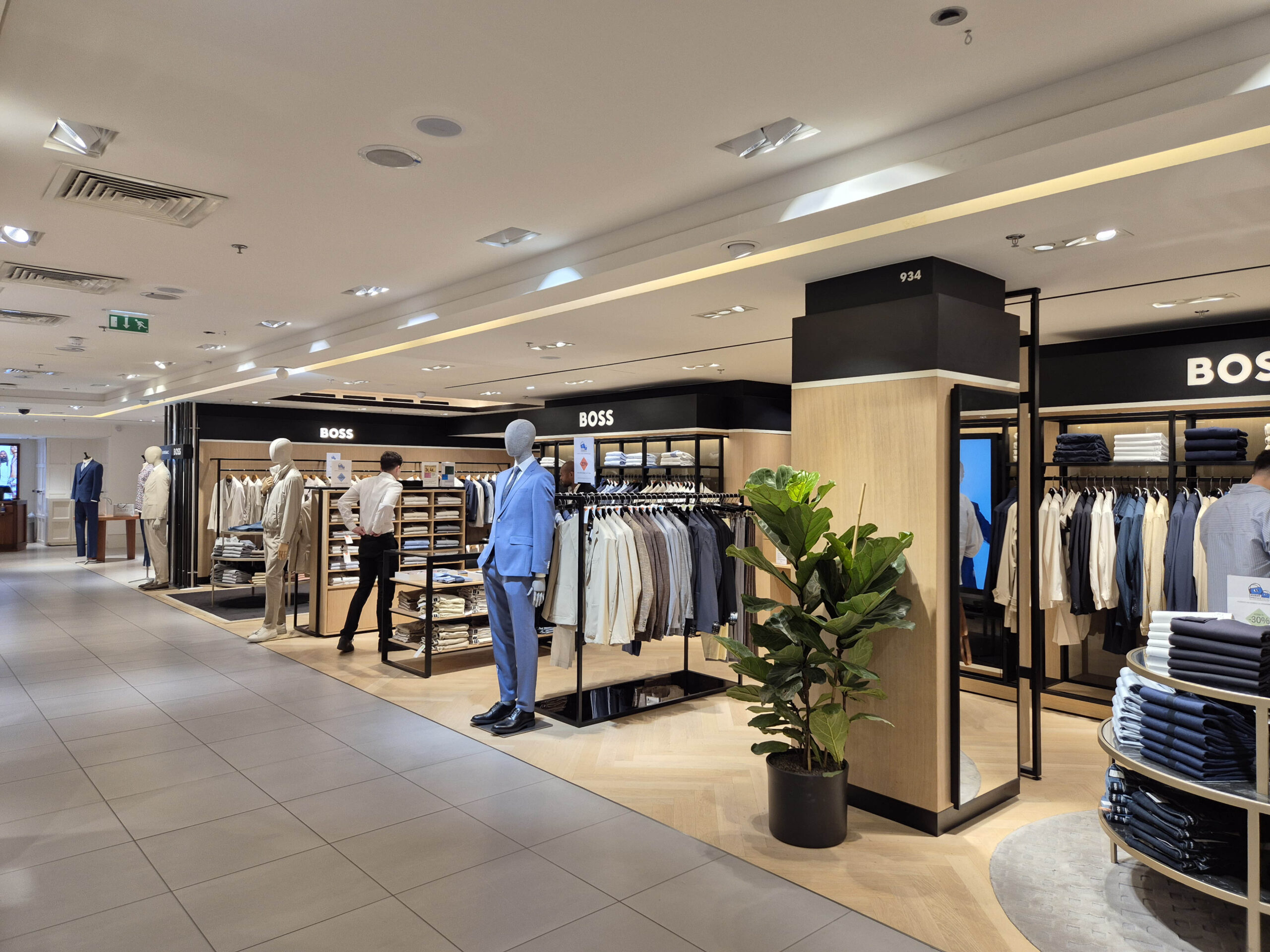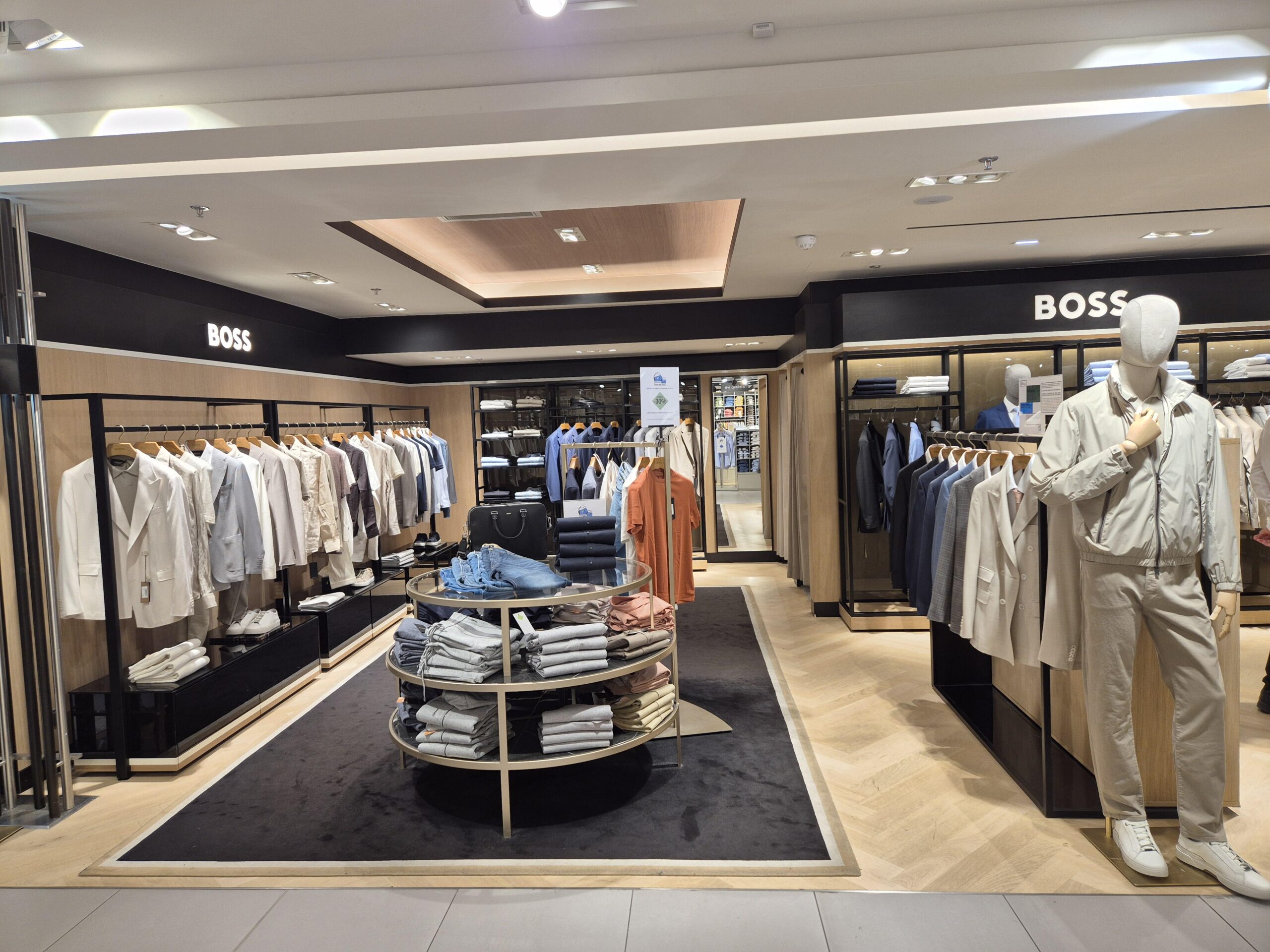 Création d’un corner Hugo Boss aux Galeries Lafayette Haussmann à Paris. Modification du plafond, remplacement du sol, pose du mobilier et de l’éclairage. Travaux en site occupé avec pose de palissades, intervention de nuit pour l’évacuation et l’approvisionnement.